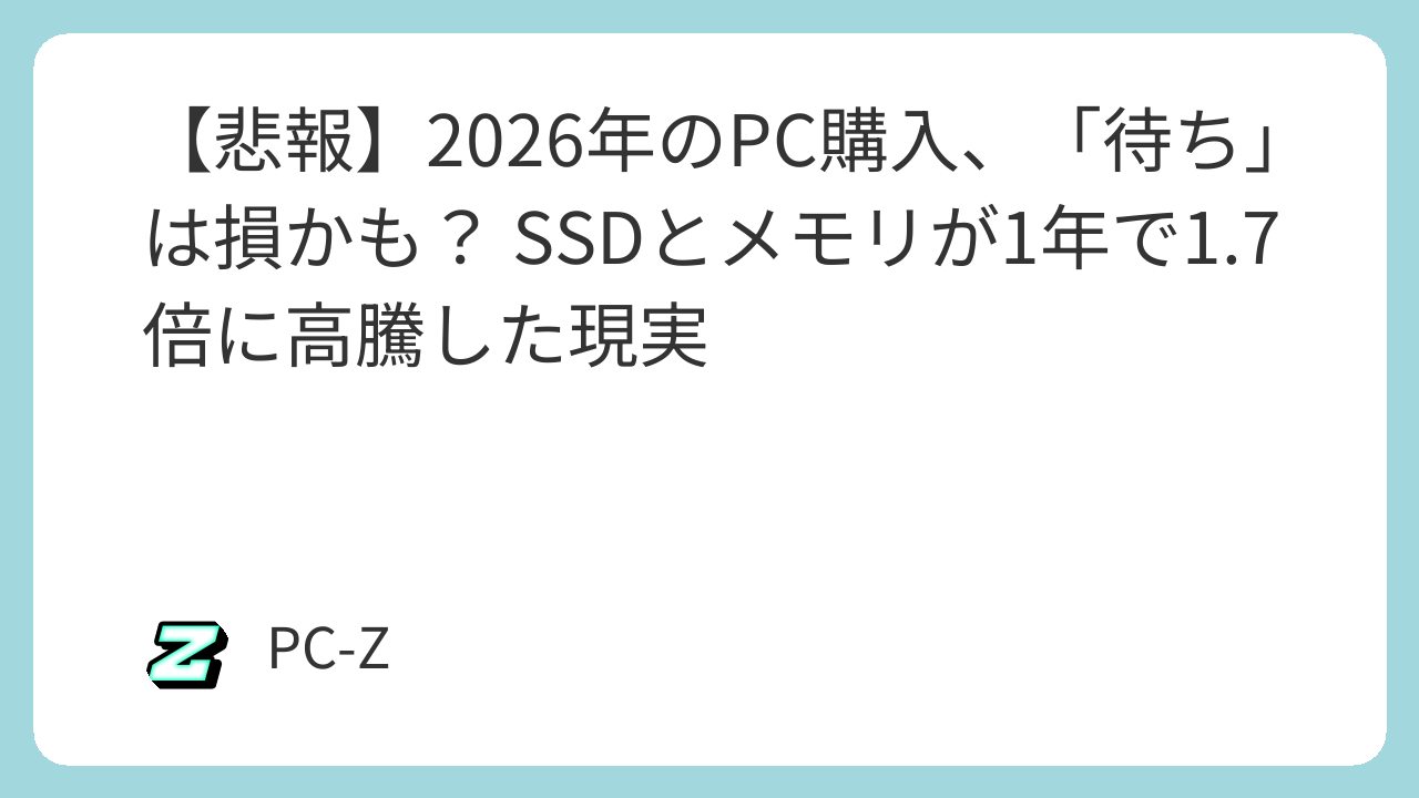 【悲報】2026年のPC購入、「待ち」は損かも? SSDとメモリが1年で1.7倍に高騰した現実